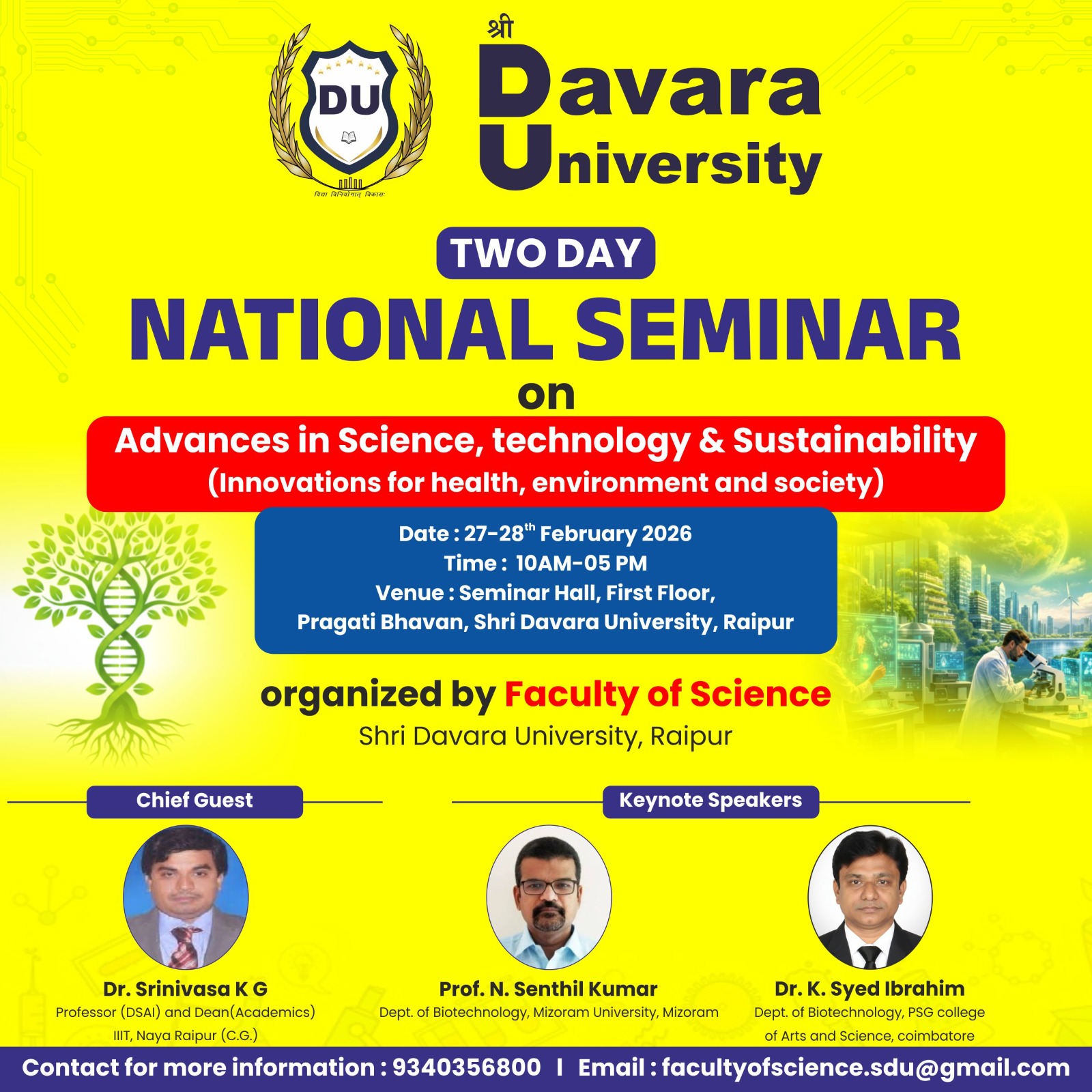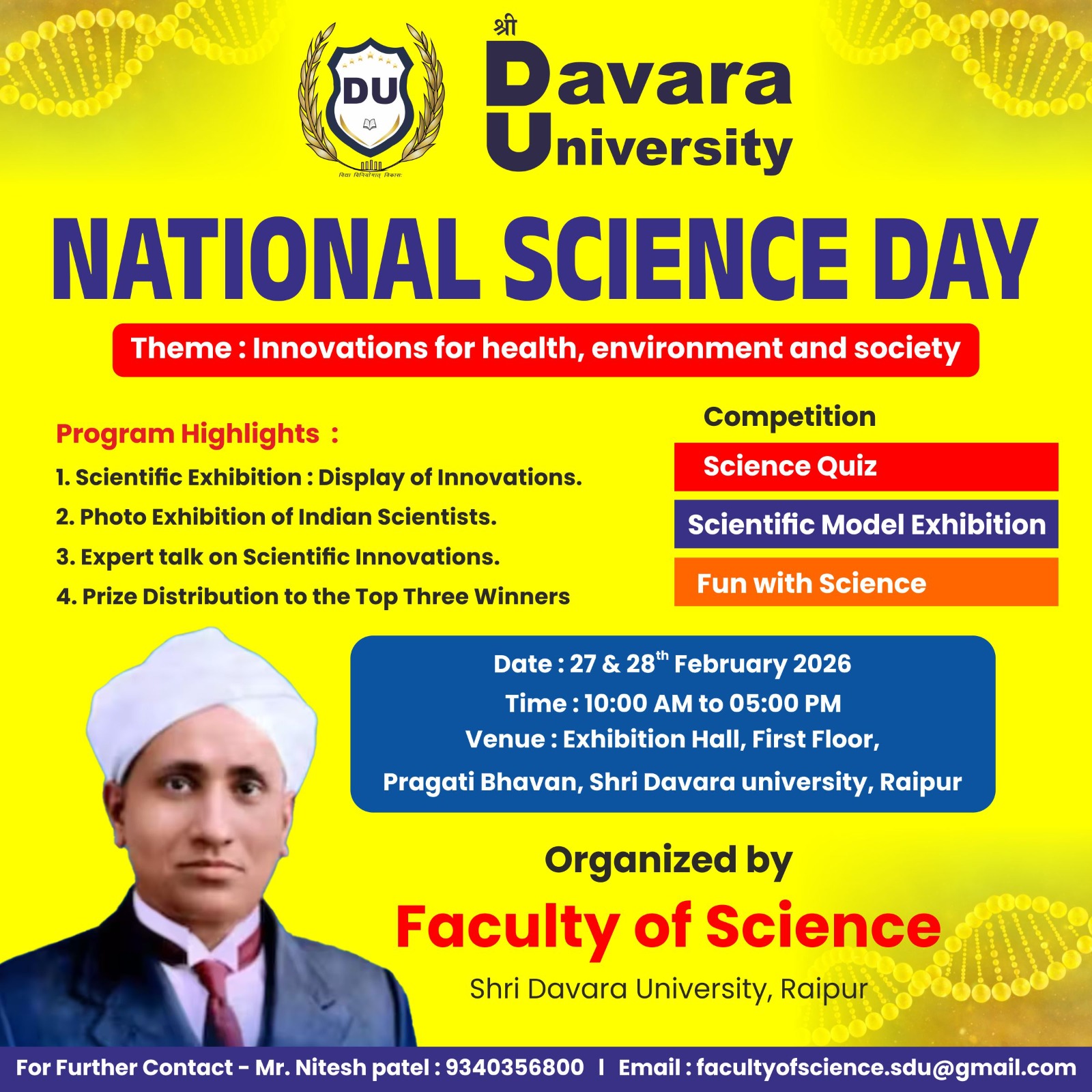 Shri Davara University, Raipur successfully organized a two-day National Science Day celebration along with its First National Seminar on 27–28 February 2026 at the Exhibition Hall, First Floor, Pragati Bhavan, University Campus.